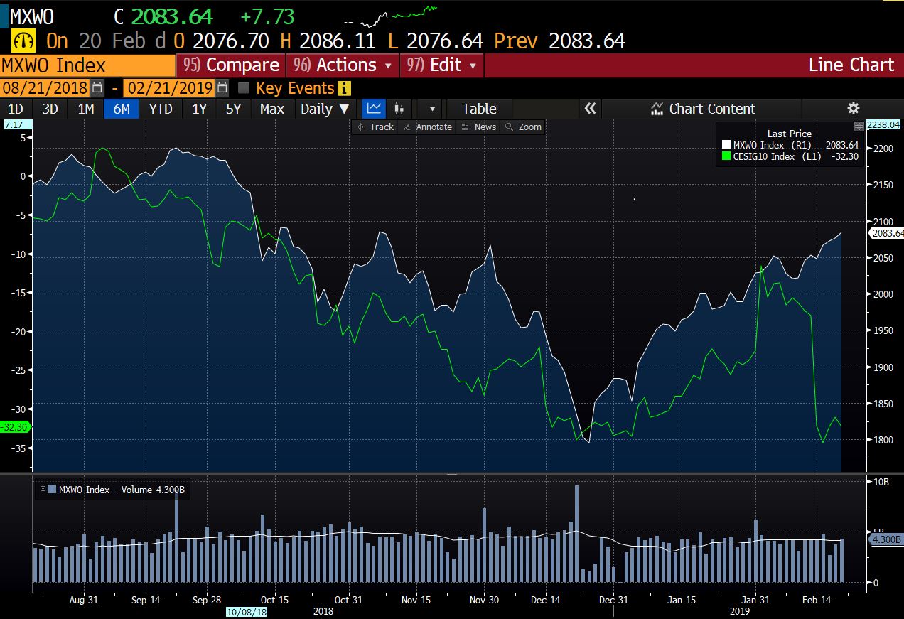 La realidad viene marcada por la ralentización global de la economía, caída de beneficios de empresas y caída de los índices de sorpresas económicas. Vean la correlación quebrada entre el índice bursátil global y el de sorpresas económicas