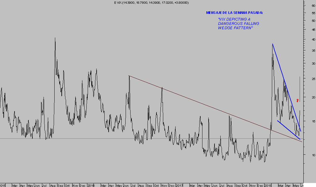 En Estados Unidos el mercado también cedió posiciones, de acuerdo con las previsiones anticipadas la pasada semana tras analizar el desarrollo de pauta de la volatilidad implícita. La pauta (cuña descendente) ha sido quebrada y desde entonces la volatilidad ha ascendido con energía, pasando de 12.2 hasta los 17 de cierre de ayer.