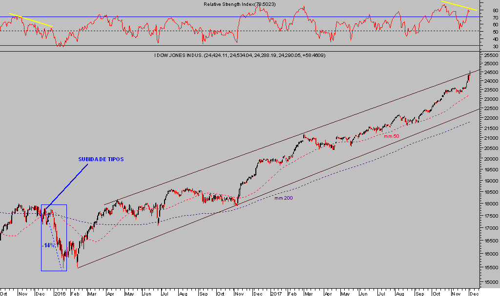 La semana próxima se reúne el Comité de Mercados Abiertos -FOMC- de la Reserva Federal y habrá nueva subida de tipos 0.25 puntos. El mercado puede responder con volatilidad y ventas, al estilo de la respuesta a la primera subida de tipos de diciembre de 2015 cuando el Dow Jones comenzó una breve corrección de 5 semanas y el 14% de caídas. Veremos.
