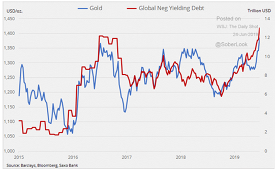 La relación entre el Oro y el aumento de la deuda global ofreciendo tipos de interés negativos (en máximos y superando los $13 billones) es muy estrecha.
