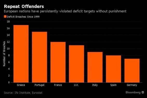 No obstante, más allá de las declaraciones orientadas a calmar los ánimos separatistas de los populistas italianos, echando un vistazo a las «posturas duras» de la UE en el pasado con países que han sobrepasado criterios de déficit, se observa que la dureza brilla por su ausencia. Vean la cantidad de veces que distintos países miembros han sobrepasado los criterios de estabilidad… sin apenas incidencias ni Euro-castigos: