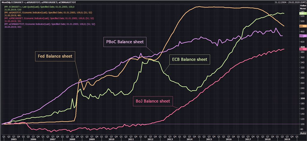 Los balances de los Bancos Centrales se han disparado en los últimos años y, aunque la FED y también el Banco Central China en menor medida han reducido ligeramente sus niveles en los últimos meses, el riesgo de nuevos estímulos de parte de ambos para tratar de comprar estabilidad en medio de una guerra comercial es elevado.