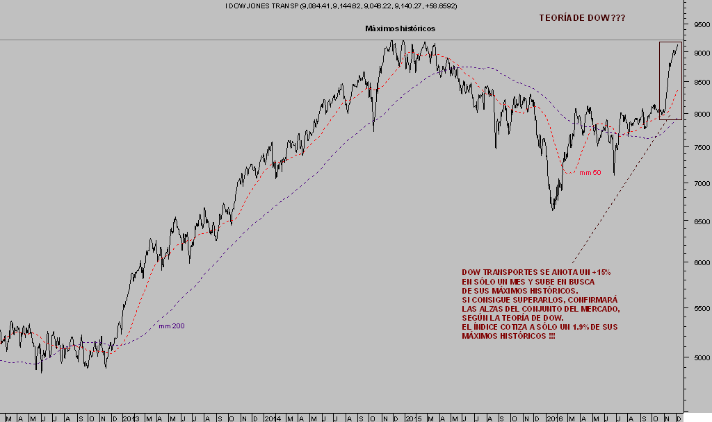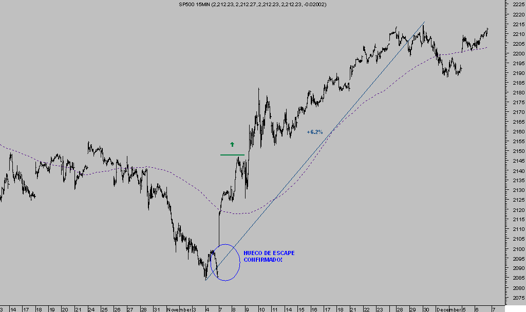 Después de anotarse una fuerte subida desde los mínimos de noviembre, el mercado de acciones USA ofreció una interesante pista sobre sus intenciones alcistas que fue compartida en el post de principios de noviembre -vean gráfico-, presenta una imagen de cierto agotamiento en el más corto plazo y posibilidad de corrección.