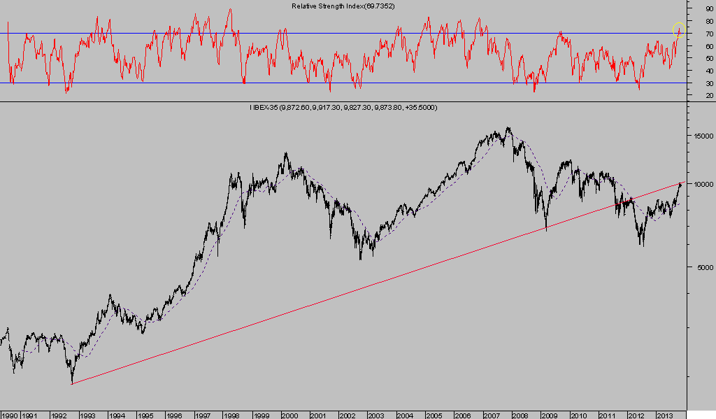 La sobre compra de los índices, tanto IBEX como IGBM es considerable aunque no extrema. En el caso del IBEX-35, indicadores como momentum o el RSI han alertado de giro con el cierre de la semana pasada y este último ha desencadenado señal de venta al caer por debajo de la cota 70 después de haber estado tres semanas por encima.