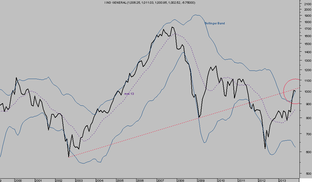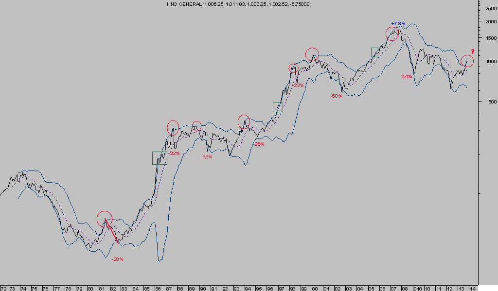 Desde 1980 cada vez que el precio del Indice General de la Bolsa de Madrid ha superado la banda superior de Bollinger en cierres mensuales, a continuación se han producido correcciones en un 80% de ocasiones y caídas que oscilan entre el 20 y 50% aproximadamente.