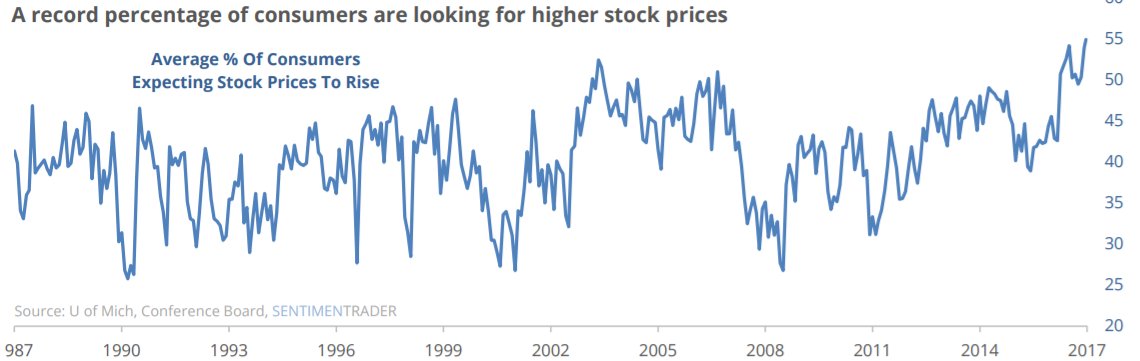 De acuerdo con datos de encuestas elaboradas por SentimenTrader, el optimismo de los inversores retail ha superado máximos de 2.000 y 2.007.