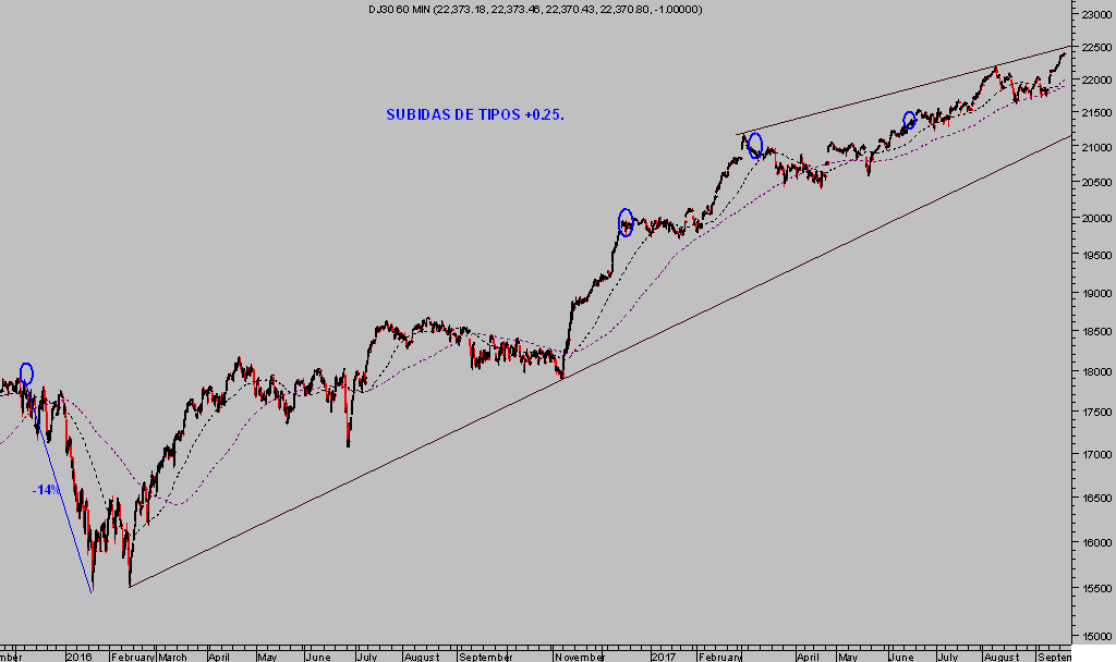 Ayer consiguieron nuevos máximos históricos, el Dow recuperó un +0.28% sin temor aparente a cualquier decisión o mensaje en clave que pueda lanzar hoy la FED. Las últimas 3 subidas de tipos han sido «aplaudidas» (apuntaladas por las autoridades) por las bolsas.