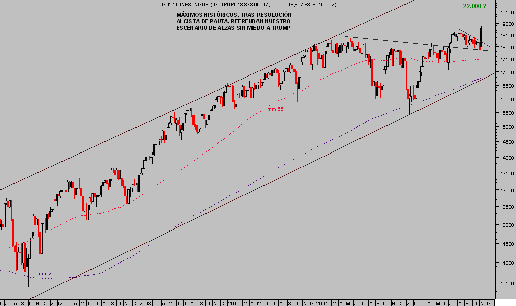 El Dow Jones registró alzas superiores al 1% en la sesión de ayer y nuevos máximos históricos tras cerrar en los 18.807 puntos, desplegando un movimiento contrario a las estimaciones de la mayoría, que esperaba caídas decididas post victoria de Trump.