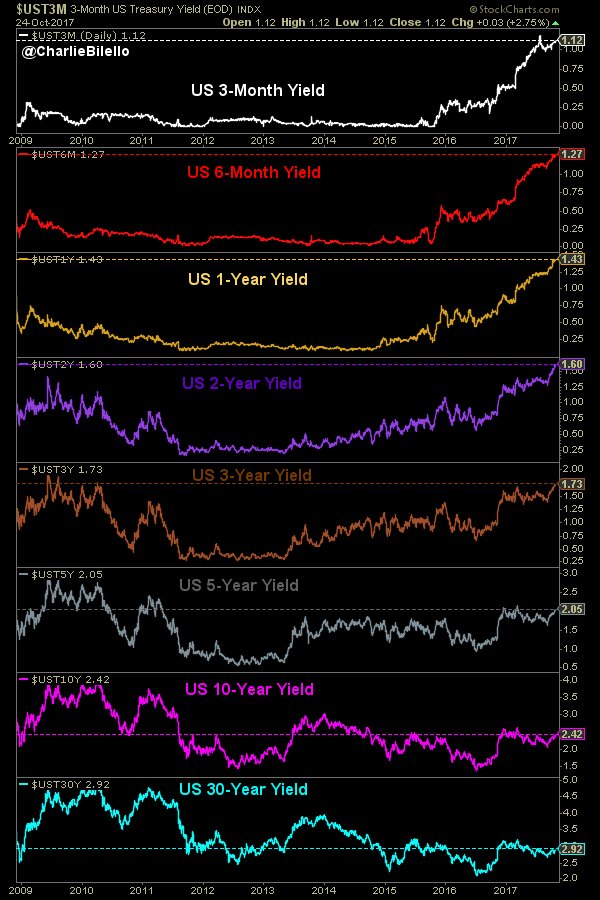 Mientras el Dow avanza fuerte y sin pausa, el entorno de tipos de interés es cada día menos favorable para la renta variable. Los tipos oficiales o FED FUNDS controlados por la FED han ascendido 4 veces desde diciembre de 2015 aunque muy lenta y gradualmente.