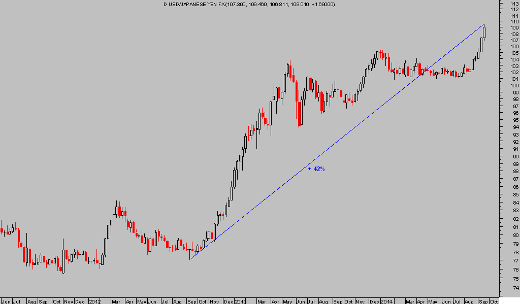 No obstante, la fuerte subida del Dólar frente al Yen de los últimos dos años, +45%, ha sido muy rápida podría dar paso a un proceso correctivo puntual en cualquier momento.