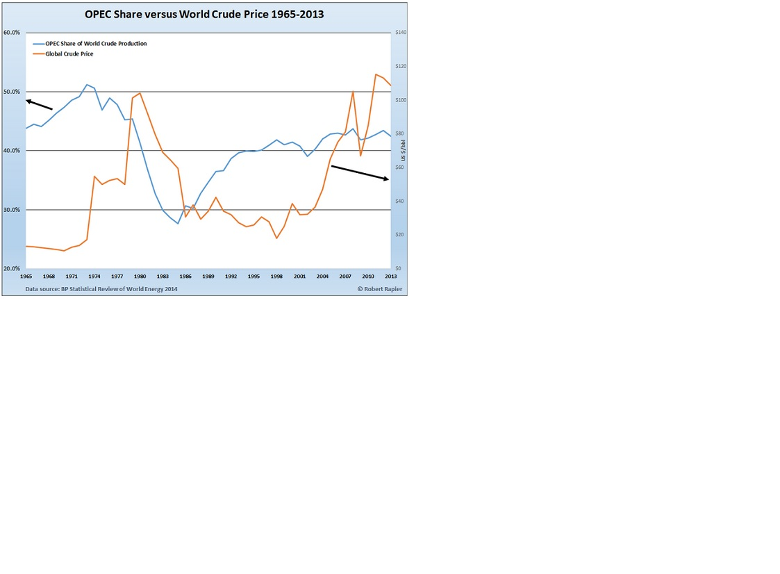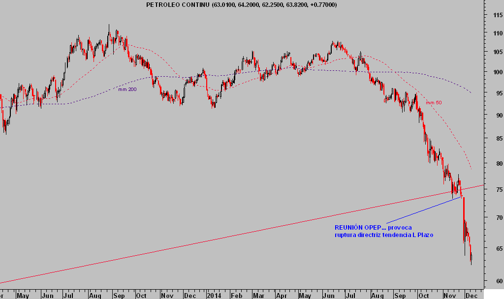 La reunión de la OPEP en Viena, 27 de noviembre, determinó mantener inalterados los niveles de oferta secundando así caídas adicionales de los precios del crudo. Además, el cartel refuerza la estrategia -de Arabia Saudí- para defender su cuota de mercado dañando la producción de energía fósil obtenida por vía de las tecnologías no convencionales, Shale Oil, Tar Sands, Fracking…