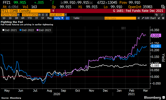 El mercado no espera novedades del «forward guiding», aunque ha comenzado a discrepar sobre las proyecciones de tipos de interés reflejadas en el «dot plot» de la FED. Los futuros de los FED FUNDS sugieren subidas de tipos más tempranas de lo que la FED afirma, hoy tendrá que trabajarse el relato para tratar de convencer a los expertos de su postura, y apunta a subidas en los próximos meses y a 3 alzas para finales de 2023.