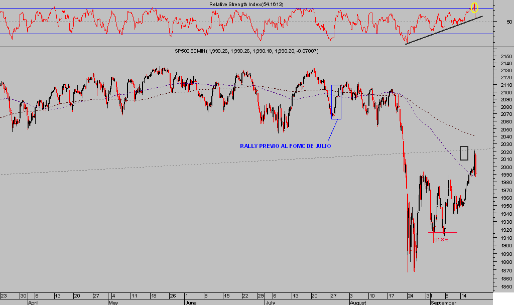 Los mercados han alcanzado los niveles objetivo más probables para el rebote técnico -caja negra del gráfico- que venimos defendiendo y argumentando técnicamente en diferentes post desde los mínimos del 25 de agosto.