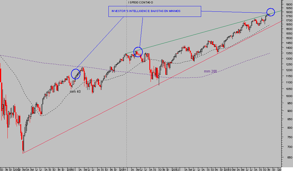La coincidencia de extremos en las encuestas con techos y correcciones subsiguientes es evidente. Lo más llamativo de la reciente encuesta de Investors I. es la amplia diferencia entre alcistas y bajistas, en 39.6, nivel extremo y que denota la seguridad que la PUT de la FED ha inoculado en los inversores, ¡como si fuese con ellos!.