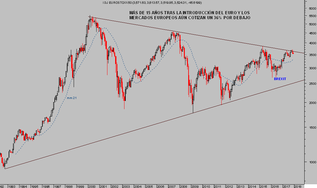 La imagen técnica del índice europeo Eurostoxx-50 dista de la dibujada por el S&P500 mostrada más arriba, vean: