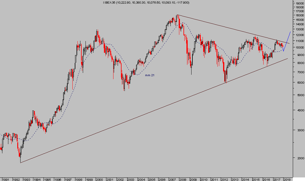 El mercado español, IBEX 35, es una de las opciones de oportunidad para el próximo año, no exenta de riesgos presenta una imagen técnica de largo plazo interesante, vean: