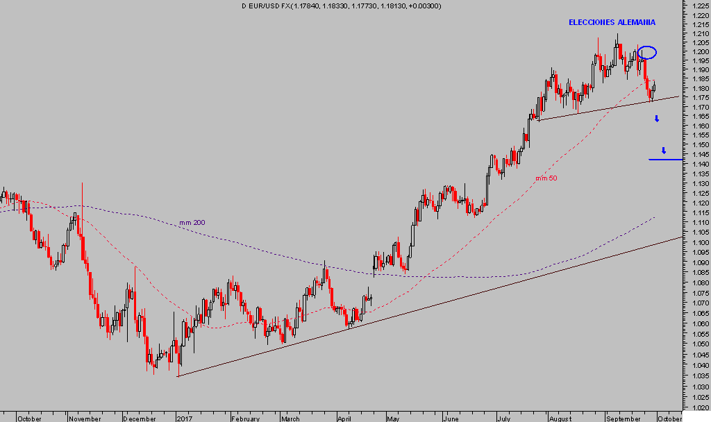 El Euro parece haber encontrado techo de medio plazo en los máximos del pasado 8 de septiembre, hipótesis confirmada con la debilidad originada tras las elecciones alemanas la semana pasada.