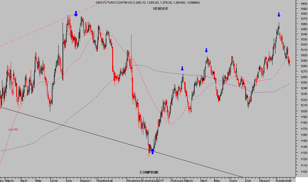 El giro del Dólar ha trasladado también su influencia al mercado de metales preciosos, originando ventas y caídas de precio anticipadas en post del día 11 de septiembre cuando cotizaba en $1.360, y cuyo objetivo inicial, en 1.270 dólares la onza, está muy próximo a la cotización actual.