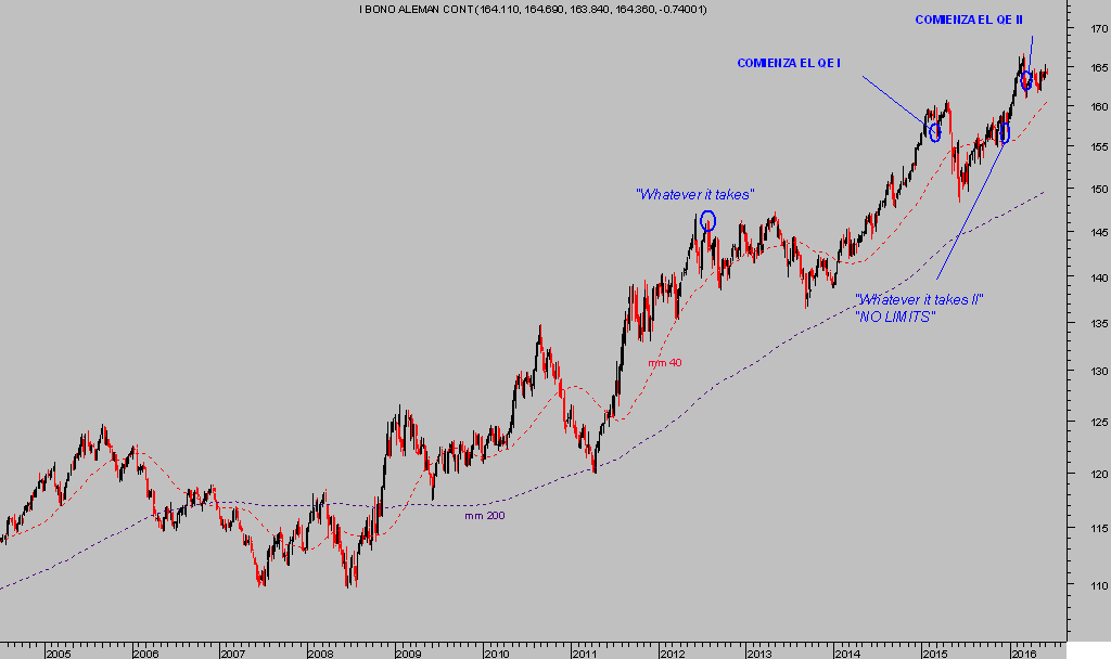 Con el tipo de interés del BUND alemán, bono germano a 10 años, cotizando en rentabilidades mínimo histórico, del 0.033%, o precios en máximos, apenas queda recorrido…