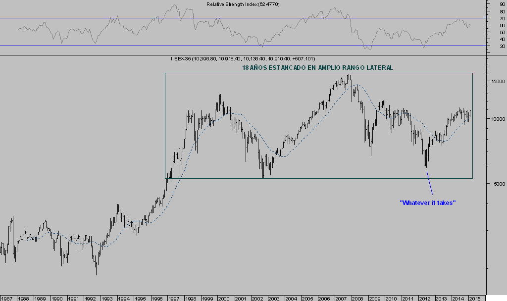 Un mercado bursátil que ha subido un 90% en poco más de dos años,desde los mínimos de verano de 2012 tras el famoso «whatever it takes» pronunciado por Draghi. En sólo las últimas 5 semanas ha subido un +13.5%.