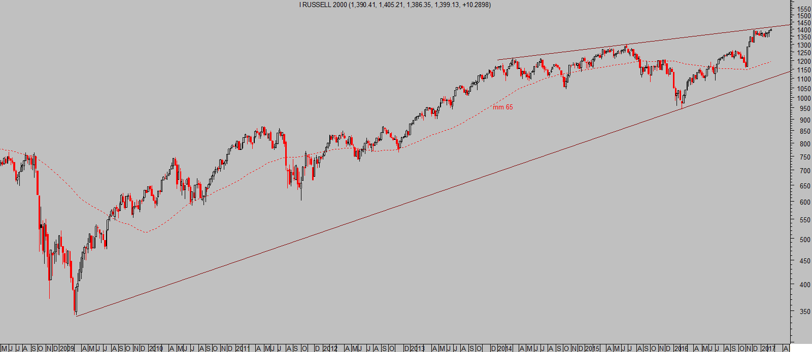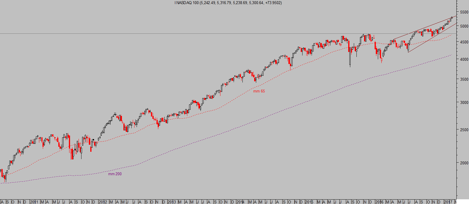 Entre ellos, también los de carácter estríctamente técnico que, tras 95 meses de alzas continuadas sin apenas correcciones o limpieza de mercado, destacan una tesitura anómala y peligrosa, vean las imágenes de medio plazo del SP500, del índice de pequeñas y medianas empresas -Russell 2000- o de los dos índices tecnológicos, el de base más amplia -Nasdaq Composite- y el selectivo -Nasdaq 100-.