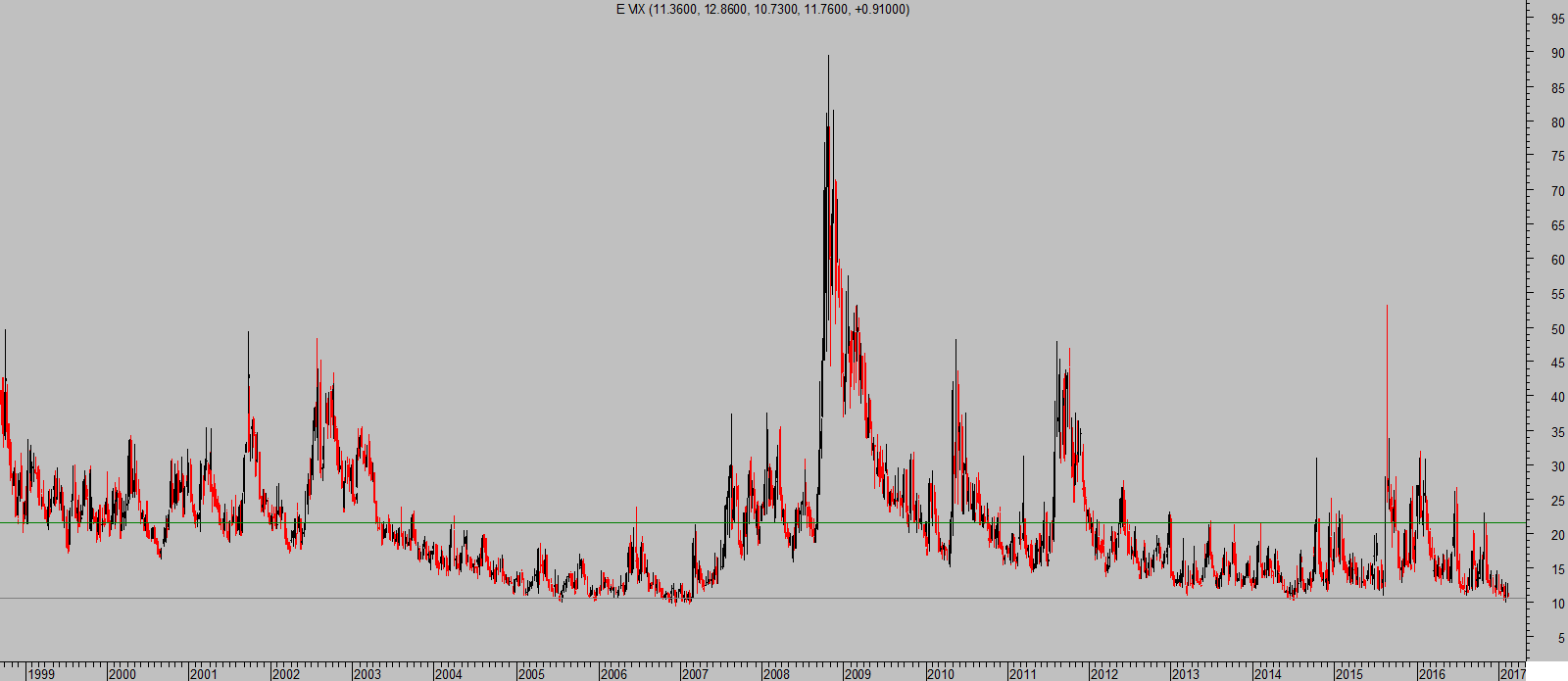 El índice de volatilidad implícita del S&P500 -VIX- refleja nos niveles de complacencia inversora suficientes para contemplar la situación con prudencia y desde la teoría de la opinión contraria. El VIX cotiza en la zona de mínimos de 2007 y aún más abajo de los mínimos alcanzados en el año 2.000.