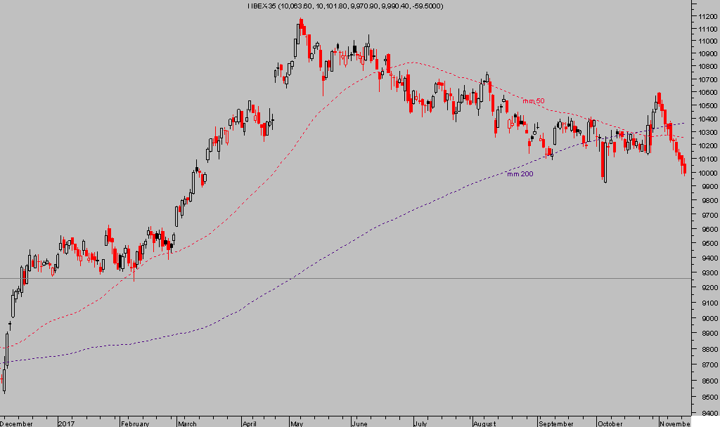 El selectivo español, IBEX-35, está sufriendo la desconfianza de los inversores en buena medida generada por el asunto catalán y encadena 10 sesiones en rojo, tal como venimos anticipando sucedería.