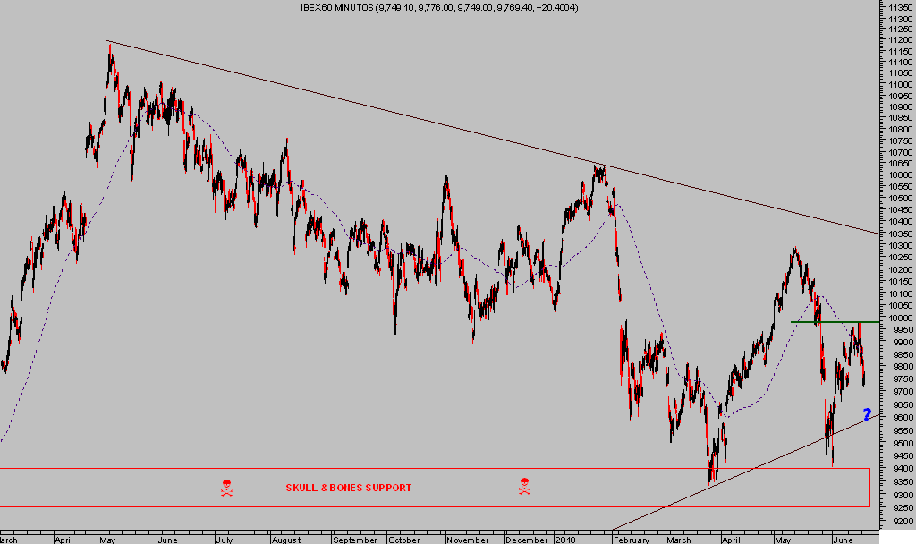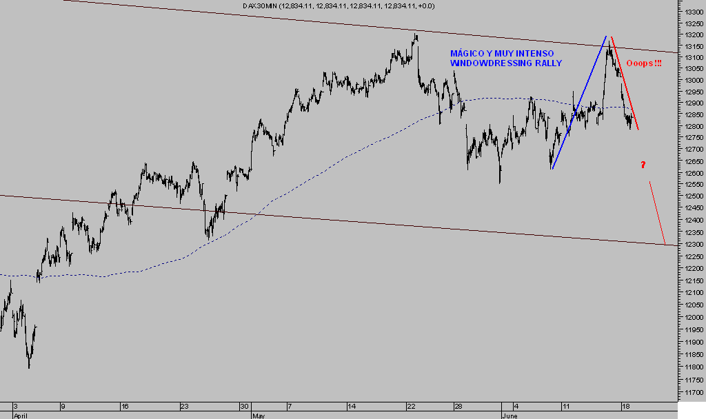 El IBEX detuvo su rally -window dressing- justamente en la zona de resistencia señalada en post de la semana pasada -trazo verde del gráfico siguiente- y desde ahí emprendió ayer una caída de gran interés e implicaciones técnicas (reservado).