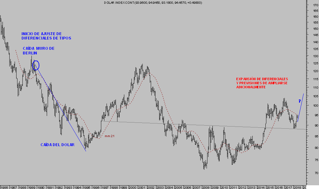 A partir de la caída del muro de Berlín comenzó a estrecharse el diferencial y en cuestión de 5 años pasó de +300 a -300 puntos básicos. En el mismo periodo, el Dólar se comportó de acuerdo con lo lógica, cumpliendo las correlaciones.