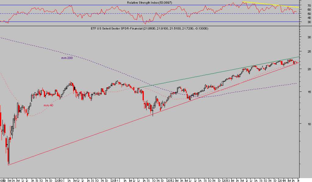 El sector financiero americano está estancadl en bolsa desde que hace 27 semanas comenzó un movimiento lateral dentro de un estrecho rango cercano al 10%.