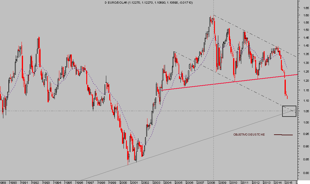 El mercado que primero reaccionó tras conocer las palabras de Draghi, a pesar de no contener sorpresa alguna, fue el de divisas. El Euro terminó la sesión cediendo posiciones, hoy profundizando, y a sólo un 2%-3% del rango superior del objetivo de medio plazo proyectado por técnicos y varias veces divulgado en este blog desde el pasado otoño.
