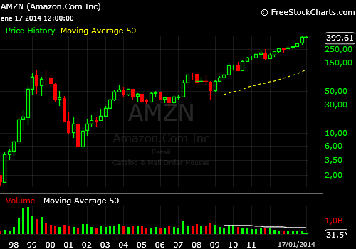 AMAZON es un ejemplo de libro, una sociedad que no gana dinero y sin embargo ha subido como la espuma, disfruta de la confianza que ha sabido comunicar a los inversores respecto de su capacidad de generarlos en el futuro y desde su salida a bolsa en 1998 ha subido un 30.669%.