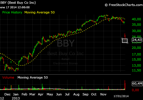 El comportamiento en bolsa de Best Buy tras presentar resultados la semana pasada fue muy negativo, los inversores castigaron valor de manera impresionante, con ventas que provocaron caídas del 35% en sólo dos sesiones.