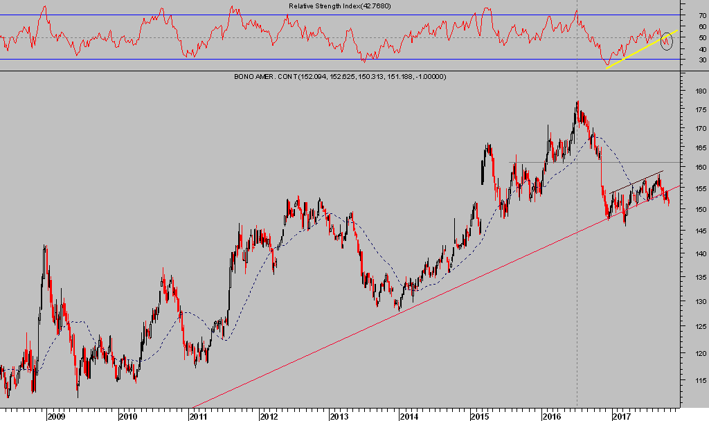 El aspecto técnico de largo plazo de los bonos USA es muy delicado y los precios, sujetados de manera artificial durante años por los programas de compra de activos -QE-, podrían sucumbir ahora que la FED trata de retirarse de la escena monetaria ultra expansiva, deja de comprar y además sube tipos.
