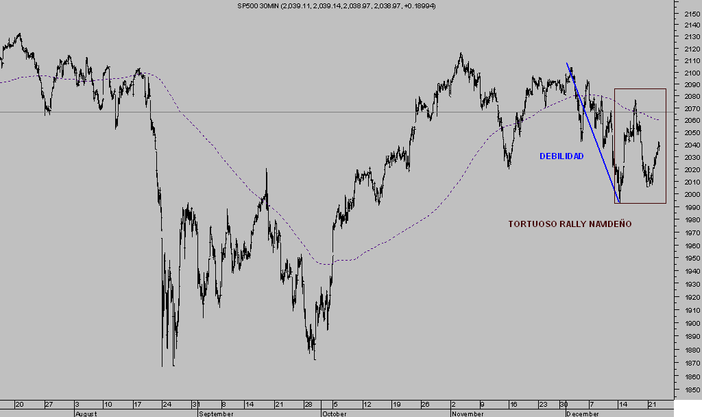 El mercado de acciones USA está desarrollando una pauta de mes de diciembre de libro, caídas en la primera quincena y recuperación posterior, aunque menos nítida de lo esperado, y carente de volumen, a medida que va desvelando interioridades.