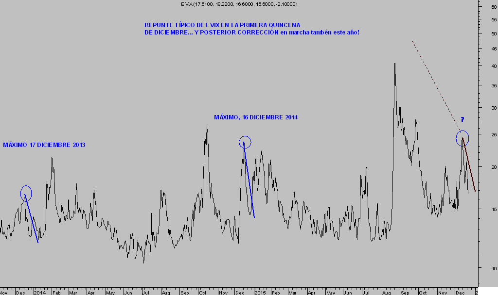 El índice de volatilidad implícita sobre el S&P500, VIX, también despliega un comportamiento alineado con su estadística estacional anticipada en el post …PROYECCIONES VIX, DOW, SP500, …. de 14 de diciembre.