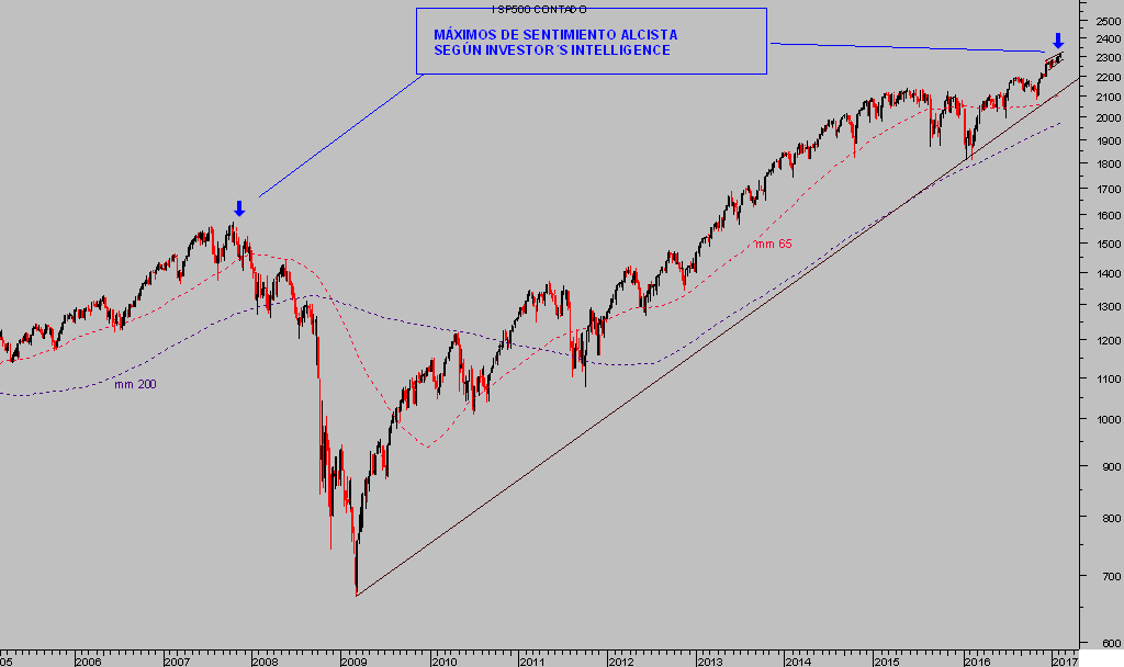 Sin embargo, la luna de miel está enamorando a los inversores hasta extremos de peligro, al mostrar una confianza sin precedentes desde el máximo de octubre de 2007, vean gráfico de Sentimiento recogidos por Investors Intelligence: