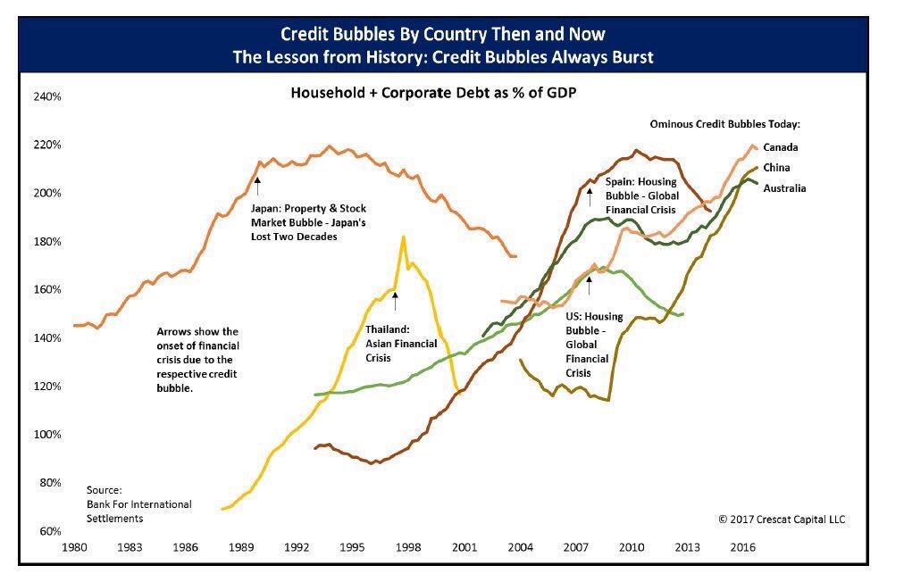 No obstante, el problema de deuda USA, siendo importante no es actualmente el que mayor preocupación entre los expertos, Canadá, China y Australia han alcanzado unos niveles realmente disparados y comparables con techos de ciclo de deuda en otros lugares y fechas, como lo fue en España en 2007 o en Japón en 1989, observen el cuadro siguiente: