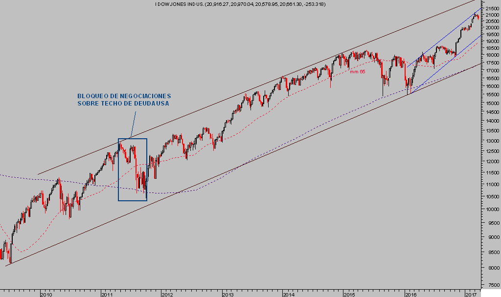 La experiencia del bloqueo de las negociaciones en el año 2011 fue muy negativa para las bolsas, el DOW Jones se dejó en el camino más del 15%.