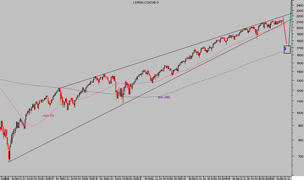 El escenario de corto y medio plazo, someramente reflejado en el siguiente gráfico del S&P500, consiste en esperar nuevos máximos marginales previos a una corrección de cierta envergadura y después nuevo Boom!.