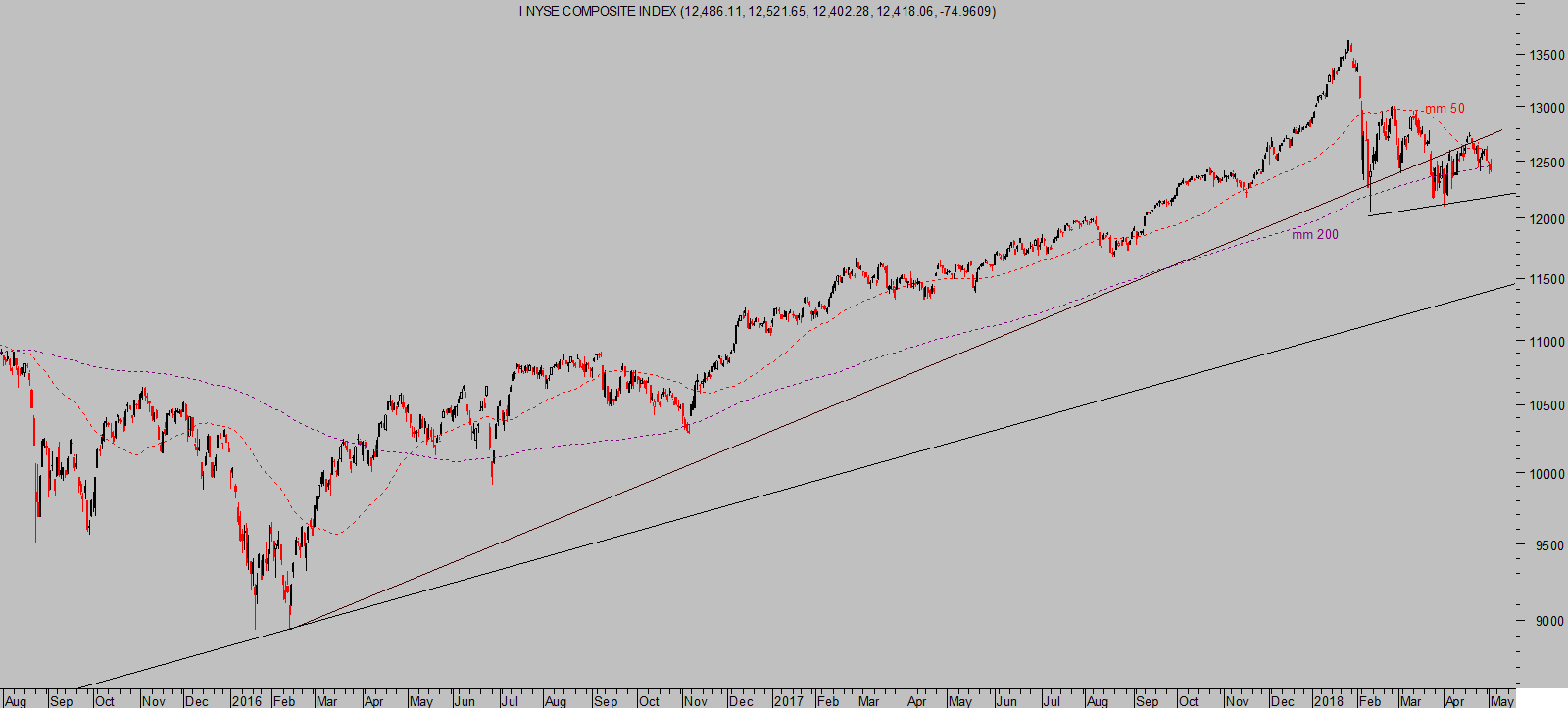 El NYSE presenta una imagen técnica muy similar a la del Dow Jones o el SP500, los tres amenazando con perder sus medias de 200 sesiones y cotizando por debajo de las de 50 sesiones desde que fuesen perforadas durante la corrección iniciada el 26 de enero.
