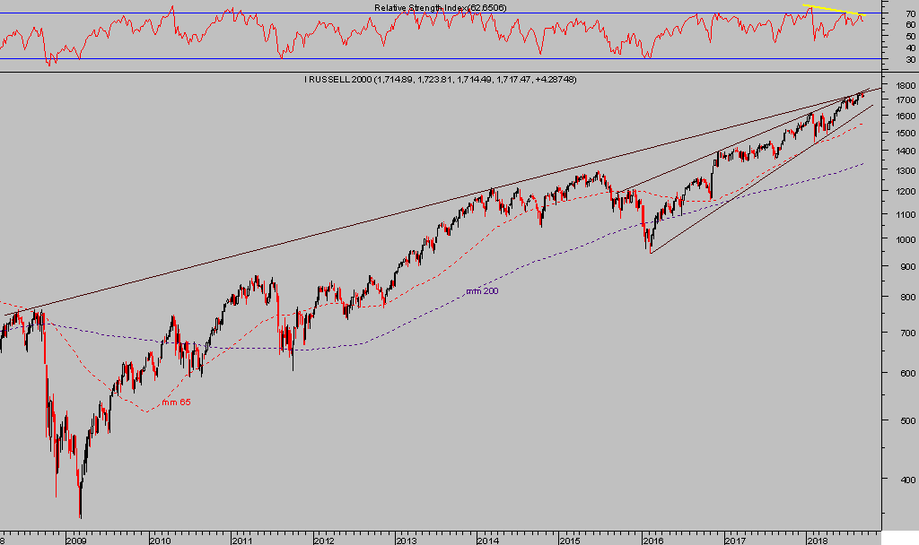 Además del sector tecnológico USA, el resto de índices muestra tendencias muy extendidas y entornos técnicos dificilmente sostenibles sin antes tomar un respiro, según revelan las pautas, sobrecompra o divergencias técnicas la vulnerabilidad es evidente. Observen por ejemplo el caso del índice de empresas medianas y pequeñas Russell 2000.