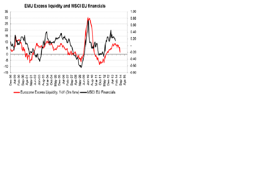 Por otra parte, la estrecha correlación entre el exceso de liquidez del sistema -EMU-, en fuerte corrección desde hace dos trimestres, y la evolución de los bancos europeos presagia algún tipo de decepción para los inversores en el futuro próximo.