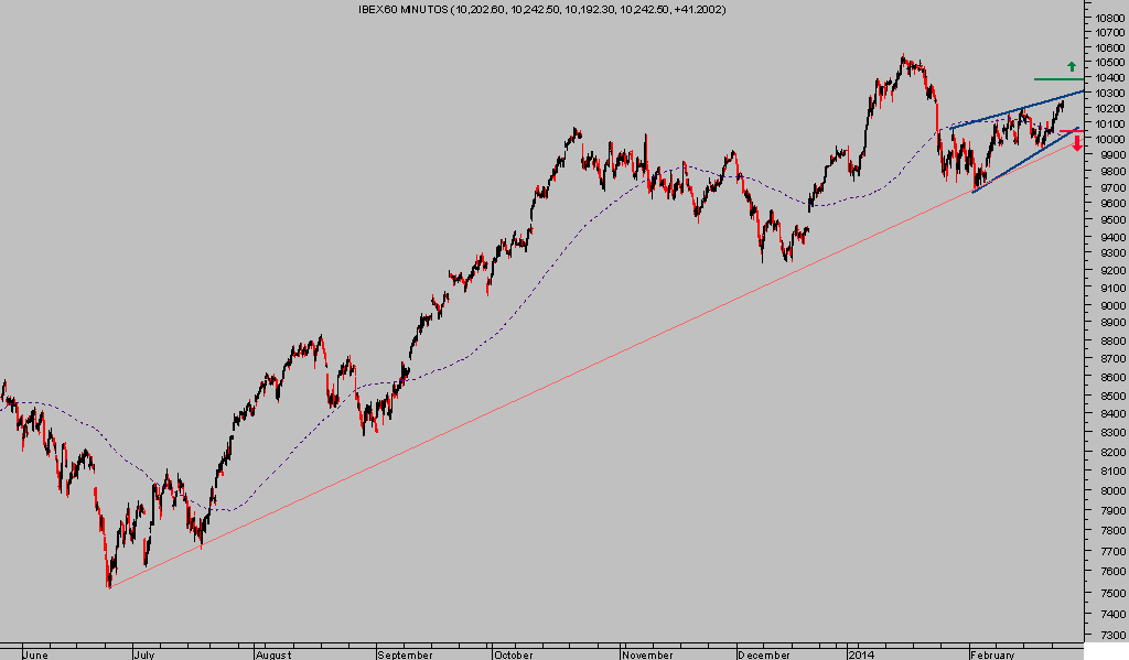 Y por último, el gráfico intradiario del selectivo español presenta signos en la recuperación desde los mínimos de principios de febrero, típicos de lecturas de rebote técnico u «ondas B» según terminología de Elliott. Esto significa que la pauta correctiva iniciada en enero por el IBEX no está completada y aún falta por desplegar una «onda C», tal como muestra el gráfico anterior diario.