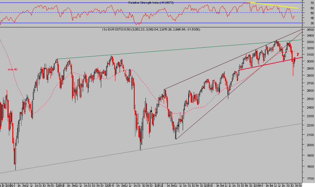 La imagen del índice europeo por excelencia, el Eurostoxx 50, es también parecida, más débil si cabe que la del Ibex-35 al haber recuperado tan sólo el 50% de la caída previa y no el 61.8%, y augura peligro también de recaída.