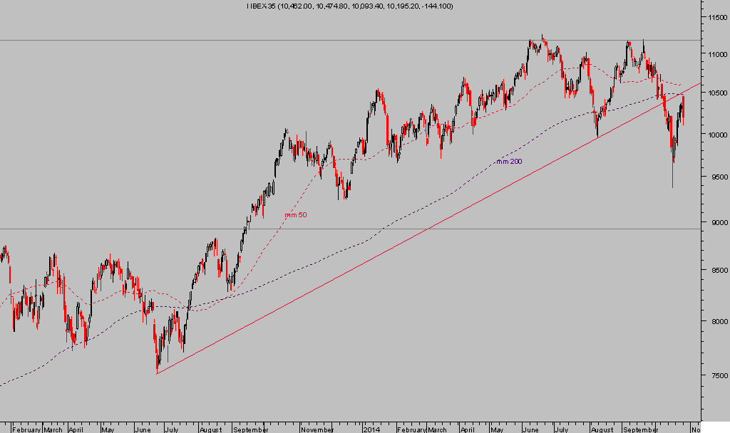 La recuperación desde el «wash-out»de la sesión del 16 de octubre ha sido en vertical, como en la generalidad de los grandes índices de bolsas occidentales. Técnicamente, el repunte ha sido suficiente para regresar al alza en busca de su media móvil de 200 sesiones, perdida el 8 de octubre, para realizar el usual test de la directriz perdida o pull-back -trazo rojo- y en ello recuperar el 0.618 de la caída previa.