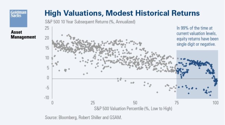 Según análisis estadístico del comportamiento del mercado a 10 años vista en un entorno de valoraciones tan rico como el actual, en un 99% de los casos, la rentabilidad ha sido negativa o de un sólo dígito. Vean análisis de dispersión y comportamiento esperado, elaborado por Robert Shiller: