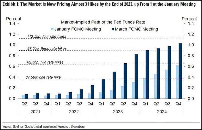 Las expectativas que maneja el mercado distan de la palabrería de las autoridades monetarias. La primera subida de tipos oficiales, FED FUNDS, apuntada por el mercado será durante el tercer trimestre del 2022. Además, los expertos proyectan que a partir de ahí comenzará una secuencia de subidas de tipos bastante más intensa de la que maneja, o dice manejar, la FED.
