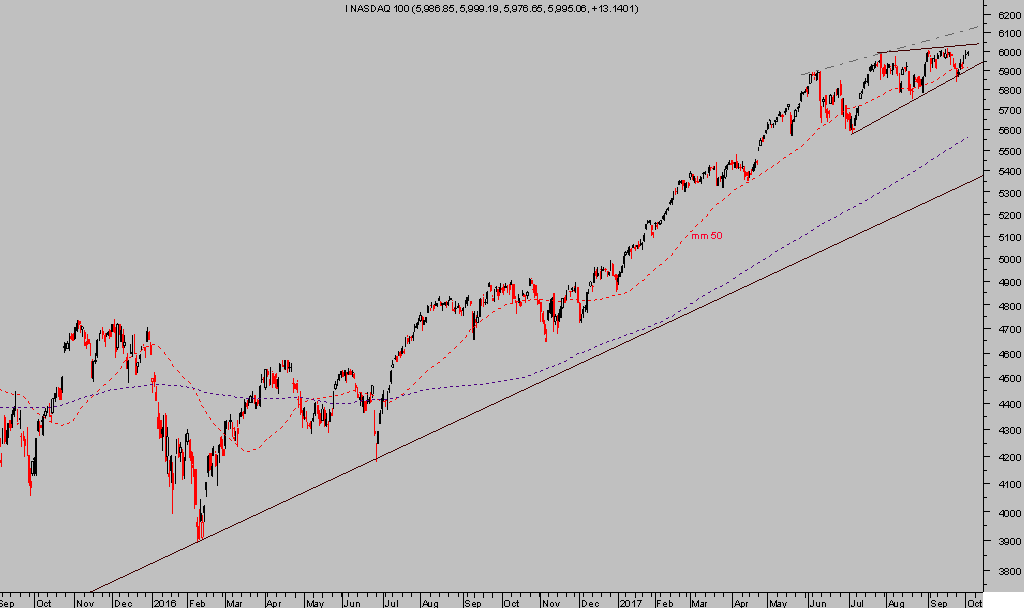 Desde que el fenoómeno FAANG comenzó a desvanecerse hace semanas, el Nasdaq no consigue registrar nuevos máximos, aunque cotiza en zona de máximos y desplegando una figura técnica farragosa y lenta, una pauta de agotamiento técnico que debería dar lugar a algún susto en el camino.