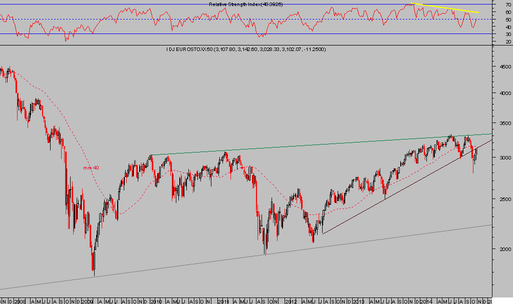 … aunque sin ser capaz de romper referencias técnicas relevantes, cerrando por debajo de su importante media móvil de 40 semanas (200 sesiones), en el 0.618% de la caída previa y por debajo también de la directriz de tendencia con origen en verano de 2012.